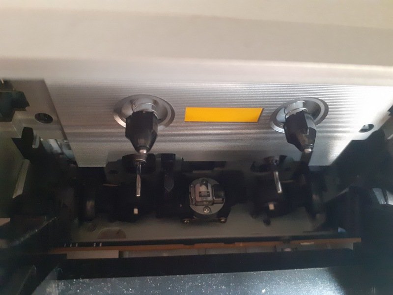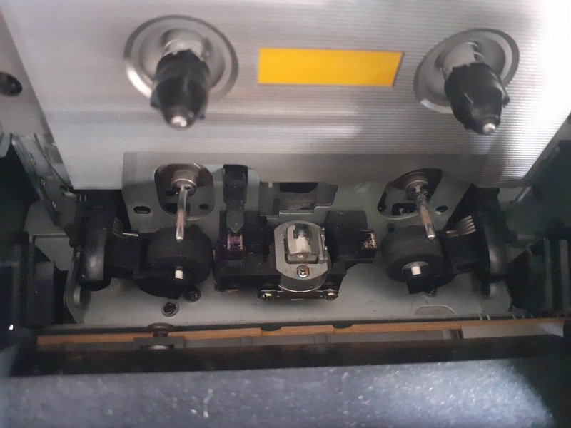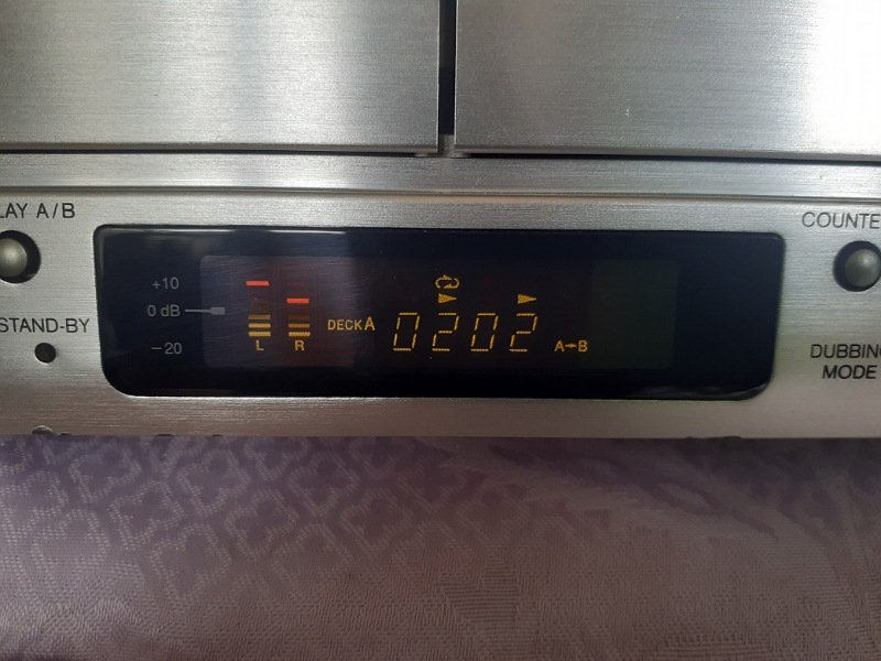 ตัวเครื่องสีทอง มี vu แสดงระดับเสียง ทั้งสองข้าง บนหน้าจอ หัวเทปยังไม่สึกทั้งสองด้าน