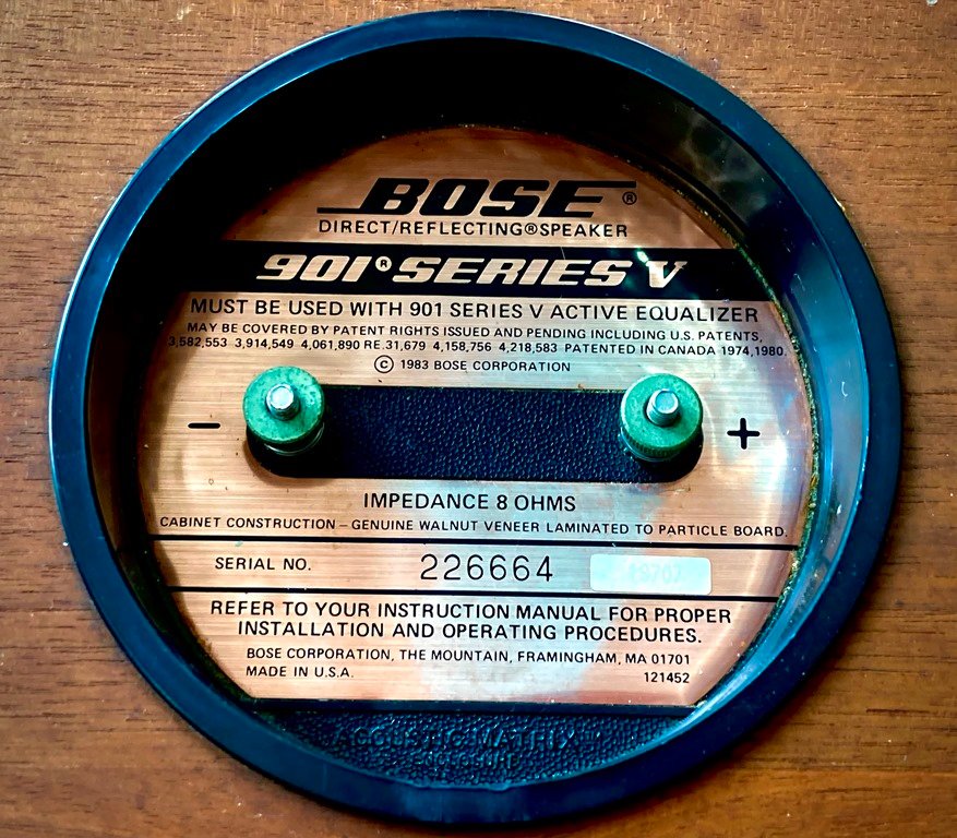901 คือ Series อันเป็นที่สุดแห่ง Bose ซึ่งถูกวางจำหน่ายในช่วงปี 1983-1987 เป็นลำโพงสวยเท่มีเอกลักษณ์ เสียงดีไม่มีใครเหมือน ลำโพงแต่ละข้างประกอบด้วย ดอกลำโพงแบบ Full Range ขนาด 4-1/2" จำนวน 9 ชุด ติดตั้งด้านหน้า 1 ชุด และด้านหลัง 8 ชุด เสียงโดยรวมมีสเกลใหญ่โอบล้อมอลังการ เวทีกว้างมิติดีมาก ที่สำคัญเสียงมาเต็มห้อง แผ่ปกคลุมทั่วอณูบริเวณได้อย่างสมบูรณ์แบบ เสียงร้องสเกลใหญ่ อิ่ม อบอุ่น มีพลัง สัมผัสได้ถึงความหวาน ความกังวาล และปลายเสียงร้องที่ทอดยาวน่าฟัง น่าหลงไหลเป็นอันมาก เบสจาก 901 V สร้างบรรยากาศได้น่าฟังสุดๆ เป็นเบสที่ลูกใหญ่ลูกโต เนื้อเบสไม่เบลอ ฐานเบสแน่นลึก ไม่มีอาการพล่ามัวให้ได้ยินครับ มาพร้อมกับ Bose Active EQ ใน Series เดียวกัน สำหรับปรับแต่งเสียงทุ้ม-แหลม ให้เด็ดดวงโดนใจตามความชอบของแต่ละท่าน