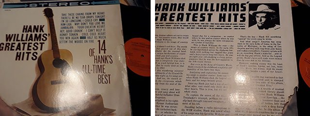 แผ่นที่ 39 HANK WILLIAMS' GREATEST HITS / YOUR CHEATIN', JAMBALAYA ฯลฯ สภาพปก VG มีรอยขาดริมปกซ้าย สภาพแผ่น VG +++ เงาสวย เป็นรอยบาง ๆ นิดหน่อย ดนตรีเดิม ราคา 400 บาทค่ะ เพลงไพเราะทั้งชุด บันทึกเสียงดีมากค่ะ