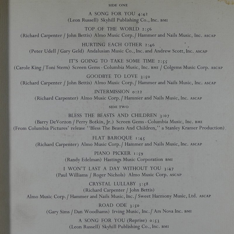 6.Carpenters A Song For You USA ปกVG++ แผ่นVG++ มีรอยบางๆเล็กน้อย 400