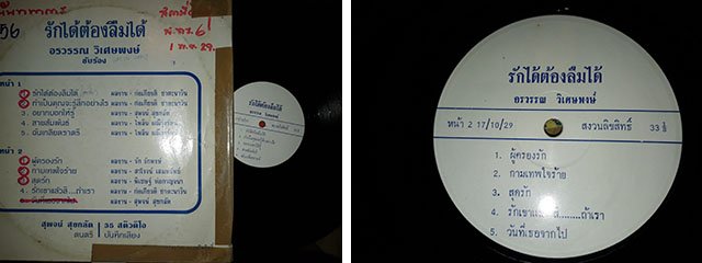 แผ่นที่ 33 อรวรรณ วิเศษพงษ์ อดีตนักร้องนำวง GREEN APPLE ขับร้องได้ไพเราะมาก เพลงดัง รักได้ต้องลืมได้, ผู้ครองรัก, อยากบอกให้รู้, กามเทพใจร้าย ฯลฯ สภาพปก VG + มีรอยสก๊อตเทปกาวที่ริมปกล่าง ริมปกขวา รอยเขียนปากกา สภาพแผ่น VG ++ เป็นรอยบาง ๆ นิดหน่อย ยังเงาสวย ราคา 200 บาทค่ะ เพลงไพเราะทั้งชุด บันทึกเสียงดีค่ะ
